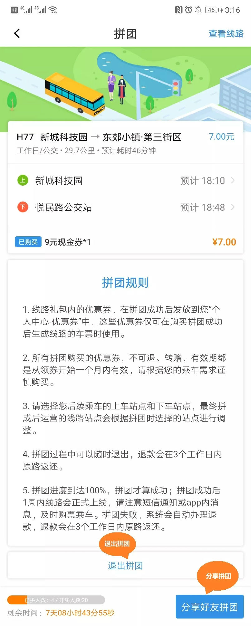 拼團(tuán)進(jìn)度達(dá)到100%之前點(diǎn)擊“退出拼團(tuán)”即可放棄拼團(tuán)系統(tǒng)都會將票款在3個工作日內(nèi)