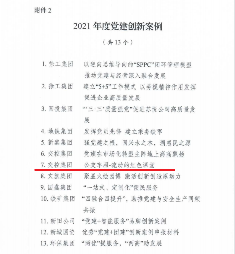 同時(shí),市國(guó)資委黨委通報(bào)了2021 年度十佳黨建品牌和優(yōu)秀"黨建+"創(chuàng)新案例評(píng)選表彰結(jié)果,徐州公交《公交車廂-流動(dòng)的紅色課堂》獲評(píng)2021年度黨建創(chuàng)新案例。