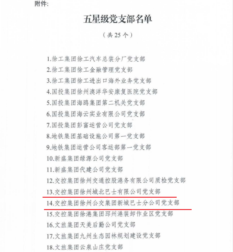 市國(guó)資委黨委還下發(fā)了《關(guān)于第三批五星級(jí)黨支部評(píng)定結(jié)果的通報(bào)》,其中徐州公交城北巴士公司黨支部、新城巴士公司黨支部被命名為“五星級(jí)黨支部”。