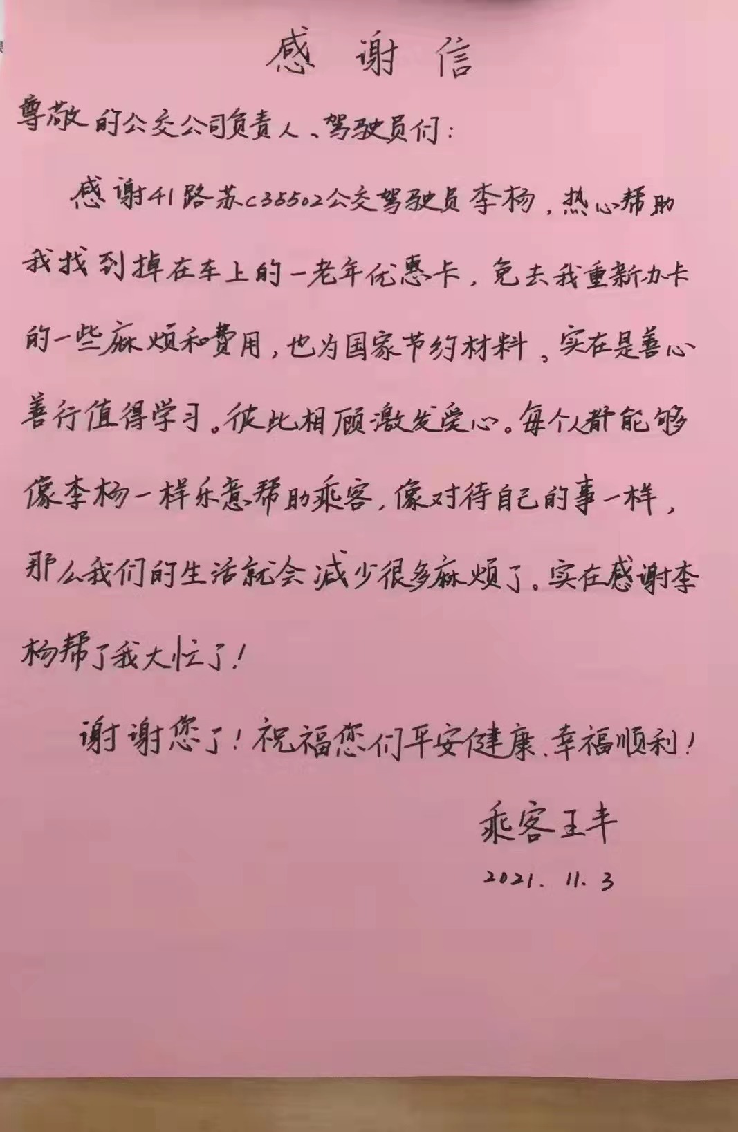 新區(qū)公司駕駛員李楊駕駛41路蘇C35502號(hào)車(chē),行駛至銀湖小區(qū)站臺(tái)時(shí),乘客王女士向其求助。王女士告訴駕駛員,早晨10點(diǎn)20分左右,她乘坐41路公交車(chē)時(shí),不慎將老年優(yōu)惠卡丟在了車(chē)上,希望李楊幫她尋找一下。李楊留下了王女士的電話(huà),待車(chē)輛到達(dá)建筑學(xué)院后,李楊立即去調(diào)度室尋找,根據(jù)王女士提供的乘車(chē)時(shí)間很快鎖定了車(chē)輛,經(jīng)詢(xún)問(wèn),王女士的老年優(yōu)惠卡已被駕駛員交到了調(diào)度室妥善保管。11月3日下午,王女士取回了失而復(fù)得的老年優(yōu)惠卡,并送來(lái)感謝信。