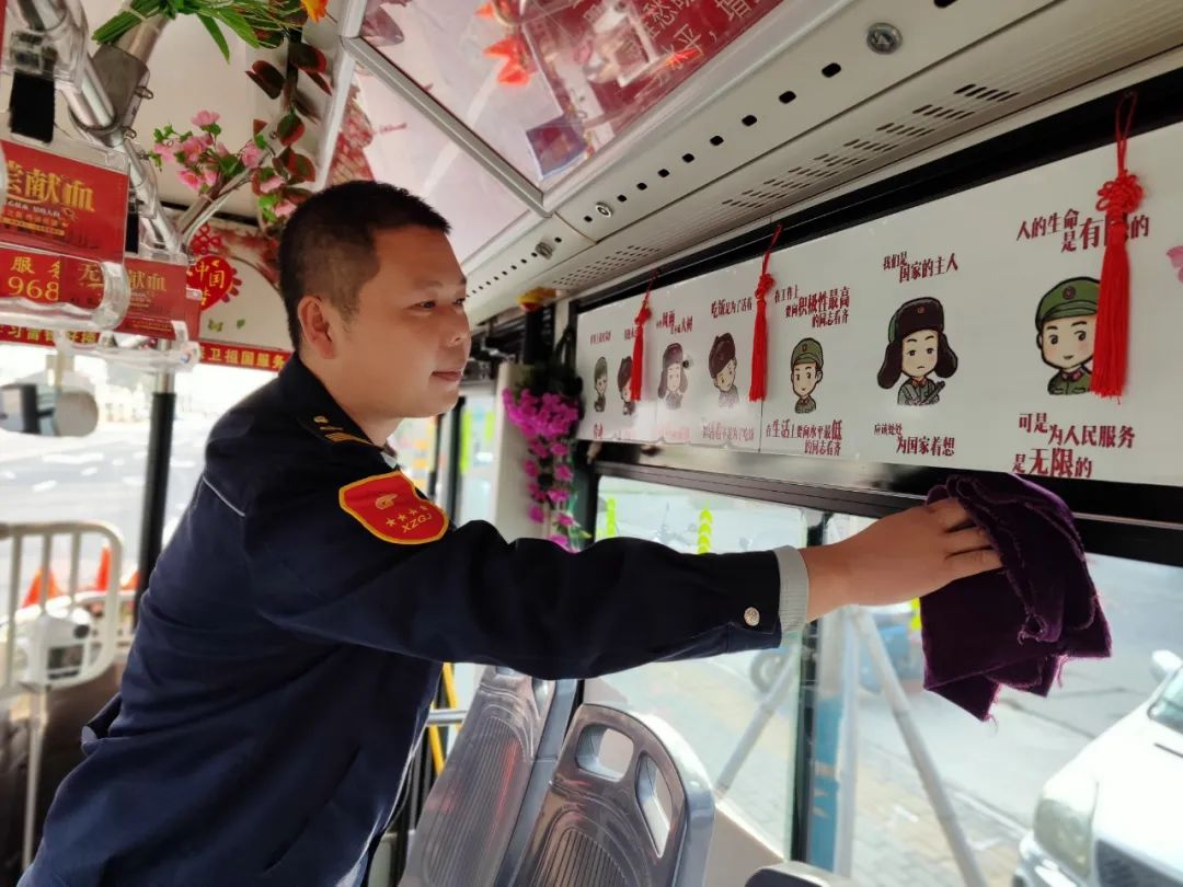 駕駛座上的王石龍雙手把住方向盤,安全平穩(wěn)駕駛著,每到一站,他都會仔細觀察乘客的上下車情況,并攙扶特需乘客坐到座位上,他用熱情的服務(wù)為乘客送去溫暖。走進王石龍的車廂,紅色的主題格外引人矚目,扶手被用紅絲絨布套包裹得嚴嚴實實,一個個的座位上整齊地放置著棉坐墊,車廂內(nèi)溫馨的感覺縈繞著乘客,感到冬日里格外的溫暖。他還自費更新了紅色小人書,放置了醫(yī)藥箱、便民袋、針線包、速效救心丸、一次性雨衣等等,細微之處彰顯了王石龍對工作的用心和對崗位的熱愛。
