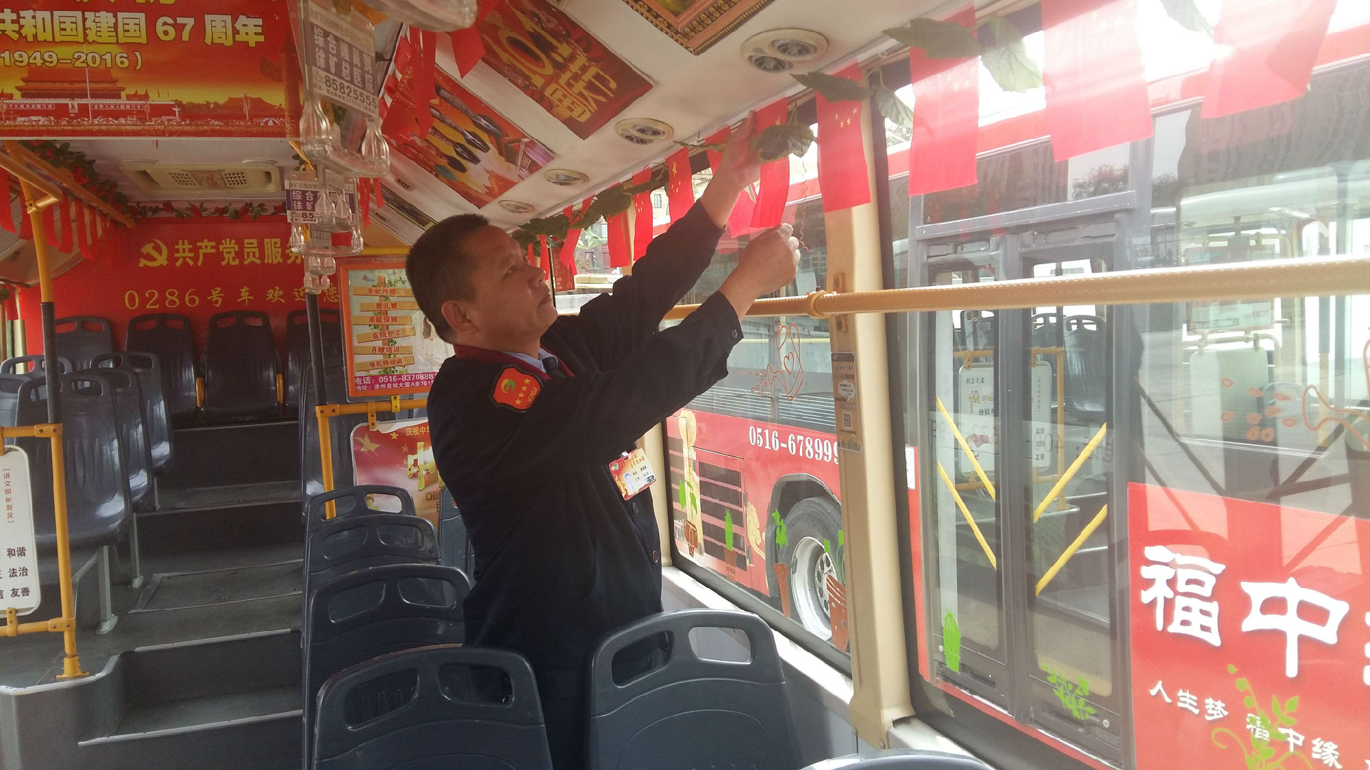 公交駕駛工作平凡、枯燥,但曹瑞國愛動腦、喜創(chuàng)新,總會給乘客不一樣的驚喜,感受不一樣的出行服務(wù)。適逢節(jié)日、活動,他總會換著花樣地自掏腰包,給車上乘客一個(gè)驚喜:春節(jié),購置小紅燈籠掛滿整個(gè)車廂,給乘客帶來濃濃的年味;母親節(jié),他準(zhǔn)備了100支康乃馨、祝???,送給“媽媽級”女乘客,道上一聲由衷的問候;今年七一,為慶祝建黨95周年,他準(zhǔn)備了95面黨旗,95本黨章,以及黨徽、紀(jì)念章給乘客,并在車廂廣播入黨宣言、革命紅歌;9月22日宣傳世界無車日,他制作了10個(gè)卡通宣傳牌,加班安裝在車廂四周,號召市民選用綠色交通工具出行,減少城市污染;十一,他將一百面國旗掛在車廂內(nèi),被媒體稱為“國旗哥”;10月9日重陽節(jié),為老年乘客發(fā)放免費(fèi)鞋墊……