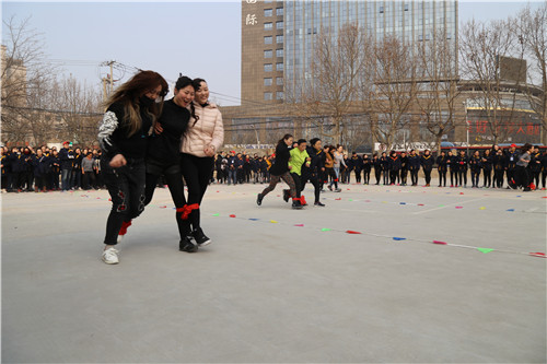 “參賽隊員各就各位!裁判員準(zhǔn)備計時!”運動會主持人一聲令下,首先開始比拼的項目是需要隊員齊心協(xié)力,發(fā)揚合作精神的“三人四足接力賽”,三人一組紅繩綁腿齊步走,每隊12名參賽隊員,比的是速度,更是勁兒往一處使的同心合力?!凹佑?!加油?。 薄耙欢?!一二!”比賽場上運動員的號子聲和場外女工們的加油聲、歡笑聲交織一起,此起彼伏。