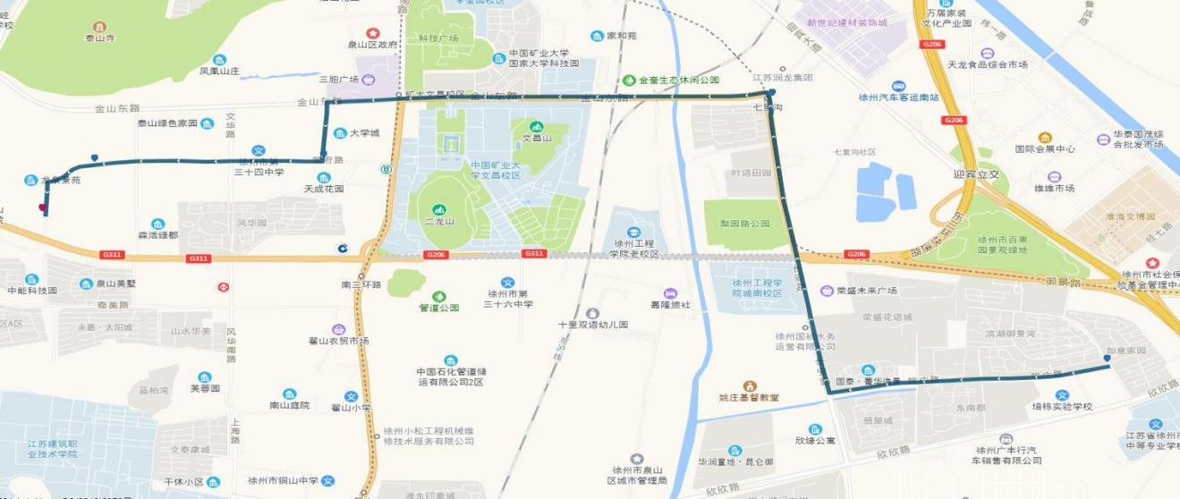 線路站點(diǎn):御景灣公交首末站、濱湖御景灣南門、姚莊街坊中心、欣欣路口、七里溝地鐵站、礦大北門、大學(xué)城、天成花園、三十四中、三十中附小、泉泰嘉苑、泉山美墅西門(路西,單向)、碧水灣小區(qū)(路北、單向)、泉山法院(路南,單向)。備注:因目前雙山路與三環(huán)南路交叉口正在施工,公交車輛無法通行,319路暫時(shí)僅運(yùn)行至泉泰嘉苑。待道路貫通后,進(jìn)行全線路運(yùn)營。