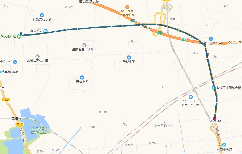 線路站點(diǎn):淮東家具城、濱河花園、九里山地鐵站、彭場、金駒物流園。