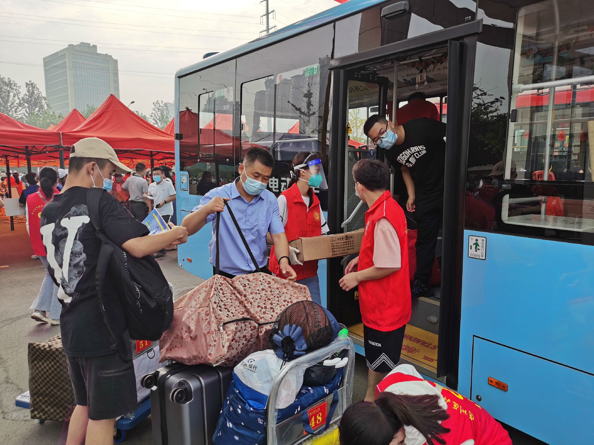 9月23日7時許,城北公司經(jīng)理室?guī)ьI(lǐng)相關(guān)科室人員早早來到學校待命,提前發(fā)放車頭引導標識,并在學校志愿者的配合下,有序地將新生接送至宿舍樓??紤]到新生進校后攜帶行李較多,公司分別在行李集中點、宿舍樓登記點安排管理人員,配合校方維持現(xiàn)場秩序,確保車輛在倒車、行車過程中安全有保障。