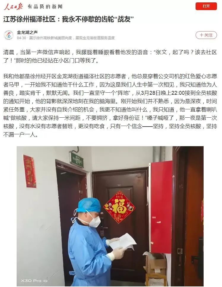 今年3月底,疫情在徐州蔓延,徐州公交停運(yùn)。鹿偉積極響應(yīng)號(hào)召,在經(jīng)開區(qū)金龍湖街道福澤社區(qū)做起了防疫志愿者,測溫、登記、消毒,只要是需要的地方都可以看到他忙碌的身影。在全員核酸檢測的進(jìn)程中,福澤社區(qū)部分工作人員因接觸密接人員而被隔離,志愿者便擔(dān)負(fù)起各個(gè)核酸點(diǎn)位的工作。從那時(shí)起,鹿偉便總是早晨第一個(gè)來,晚上最后一個(gè)走。全員核酸一輪接一輪,不管安排什么工作,他每天都如約而至,從不遲到,從不停歇。而他口中永遠(yuǎn)都只有一句話:“只要沒開工,我就天天干,開工了我就要上班去。”多么淳樸的一句話,簡潔明了,可是,卻無不透露著他內(nèi)心深處的干凈、純粹、無私、大愛、無怨無悔。很多人會(huì)問他為什么這么堅(jiān)持不懈,是什么讓他這樣干勁十足,他的回答一直都是:“我喜歡付出,我覺得這樣活得很踏實(shí)、很充實(shí),家里人也很支持我。”