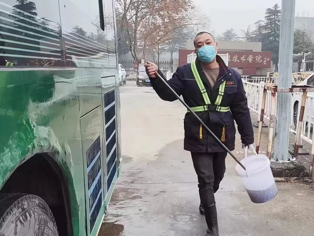 春運期間,為保障廣大市民乘客出行需求,部分公交線路縮短了發(fā)車時間,增加了運營車輛,再加上客流增多,路面擁堵等情況,公交車回到終點站停放的時間很短,又要投入到下一趟的運營當中,這無疑給車輛保潔工作帶來了一定的困難。因此,為確保出場車輛干凈整潔,每天天沒亮,張璞已經在建筑學院停車場里忙起來了。只見他一手拿毛刷,一手拎水桶,開始清潔車廂外部,張璞動作嫻熟地擦拭前擋風玻璃、車廂外部兩側,不一會,他的臉上就已掛滿了汗珠,平均一輛車10分鐘的清潔時間,是他十多年工作鍛煉出來的速度。近日氣溫驟降,持續(xù)有冰凍天氣,如果抹布太濕,早晨擦座椅時會粘在上面,為此張璞都會提前準備好潮濕的抹布,既能擦掉扶手、座椅、靠背上的浮塵,還不會留下水漬。像這樣日復一日的簡單工作,張璞堅持了十多年,他平均每天要打掃23臺車,平均一輛車10分鐘的清潔時間,張璞用自己的勞動,換來了車輛的干凈整潔。