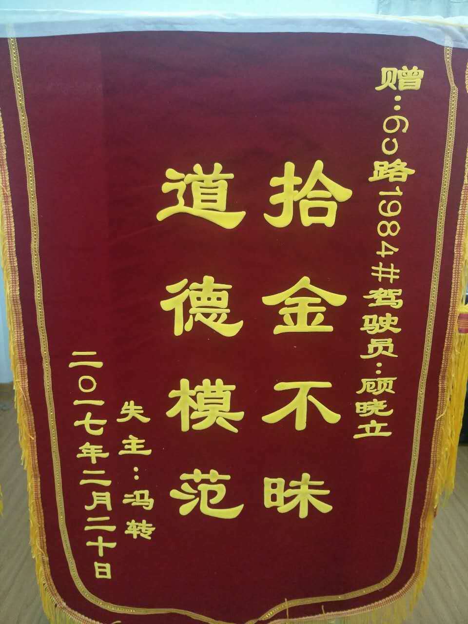 2月20日上午,乘客馮先生從第四人民醫(yī)院乘65路車到礦務(wù)局下車去兒童醫(yī)院給孩子看病,匆忙下車時把手提包丟在車上,當(dāng)時非常著急,內(nèi)有身份證兩張,銀行卡數(shù)張,由于丟失身份證不能給孩子辦理出院手續(xù),焦急萬分。65路1984號車駕駛員顧曉立拾到后,妥善保管,交還馮先生。馮先生十分感謝,特送來錦旗一面,并撥打12345表揚。