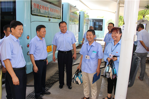 炎炎烈日下,空調公交車成為市民出行首選。為給市民營造舒適、涼爽的乘車環(huán)境,各運營公司應用公交GPS智能調度系統(tǒng),科學調度、靈活排班、保證運力充足。同時,結合創(chuàng)建工作,提高服務質量,全市2100多輛空調車全部開足冷氣;駕乘人員揮汗如雨堅持“一趟一清掃”,認真做好車輛清潔工作;督導隊員冒著高溫在各大站臺維持秩序、扶老攜幼、做好導乘服務、嚴查易燃易爆及危險品。由于各項舉措落實到位,確保了高溫期間全市161條公交線路運營順暢,乘客走好走了。(圖為董事長、總經理杜紅軍,總經理助理李修超一行在食品城充電站慰問堅守崗位的充電員工。)