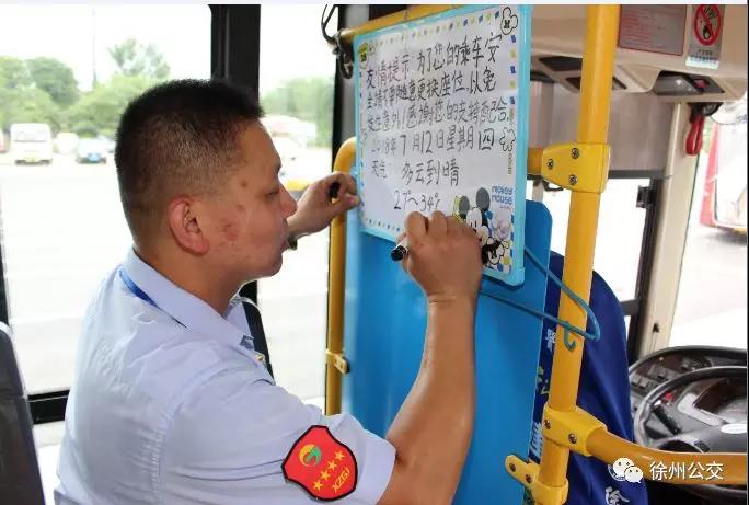 原來他已養(yǎng)成了習(xí)慣,在他的駕駛室后方掛著一塊白板,寫著乘車的溫馨提示語和天氣情況。每天他都會(huì)記錄下當(dāng)天的天氣情況:“為了您的乘車安全,請不要隨意更換座位。感謝您的支持!2018年7月12日星期四,多云到晴,27~34攝氏度”,“特別是老年人、孩子,開車時(shí)換位子太危險(xiǎn)了?!毖λ山忉尩?。