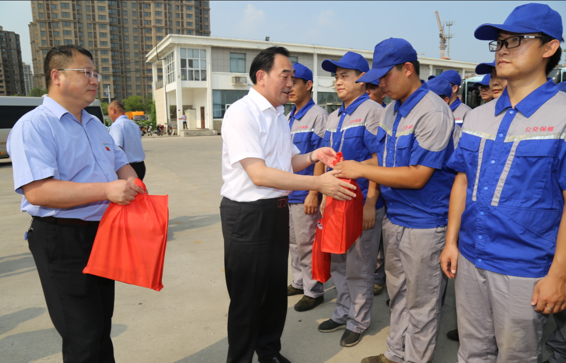 在烈日下的公交郭莊停車場,周鐵根書記看到堅守崗位的公交員工們汗流浹背,親切地上前與公交駕駛員、修理人員等一線員工一一握手?!按蠹倚量嗔?!感謝你們!”他對廣大公交員工為保障全市人民高溫天氣正常出行所付出的辛勤勞動表示充分肯定,又將洗發(fā)水、毛巾、肥皂等降暑物品,以及《安全生產(chǎn)知識職工普及讀本》等書一一送到公交員工手中,叮囑有關負責人,要多愛護、關心一線職工,切實做好防暑降溫措施,為公交員工創(chuàng)造好的工作條件,切實維護廣大職工的安康權(quán)益,確保高溫天里職工的身體健康和安全生產(chǎn),讓職工安全度夏、清涼度夏,真正感受到黨和政府的關懷、工會組織的關心和社會各界的關愛。他還關心地叮囑公交員工們要勞逸結(jié)合,做好高溫防護,保重身體,杜絕疲勞駕駛,確保安全行車,并希望大家更好地堅守崗位、服務群眾,為保障市民安全有序的出行環(huán)境,打造我市優(yōu)化營商環(huán)境、營造文明城市良好氛圍做出更大的貢獻。