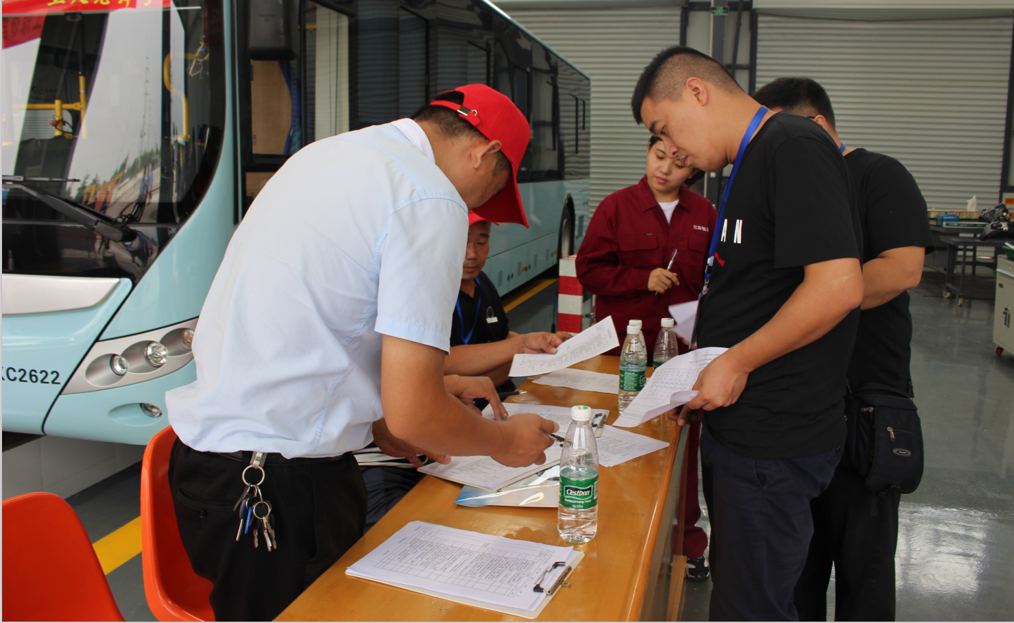 為充分展現(xiàn)公交駕駛員及修理工的技術(shù)水平,比賽項目的設(shè)置緊密結(jié)合兩工種的工作實際,其中,駕駛員實操比賽共設(shè):起始點發(fā)車、道路駕駛、限速限寬門、起伏路、站點停車、連續(xù)障礙、S彎道通過、單邊橋、靶心定點平穩(wěn)停車、平穩(wěn)駕駛等10個項目,維修實操比賽包括盤式制動器拆裝組合、新能源電控故障排除、新能源空調(diào)故障排除等3個項目。